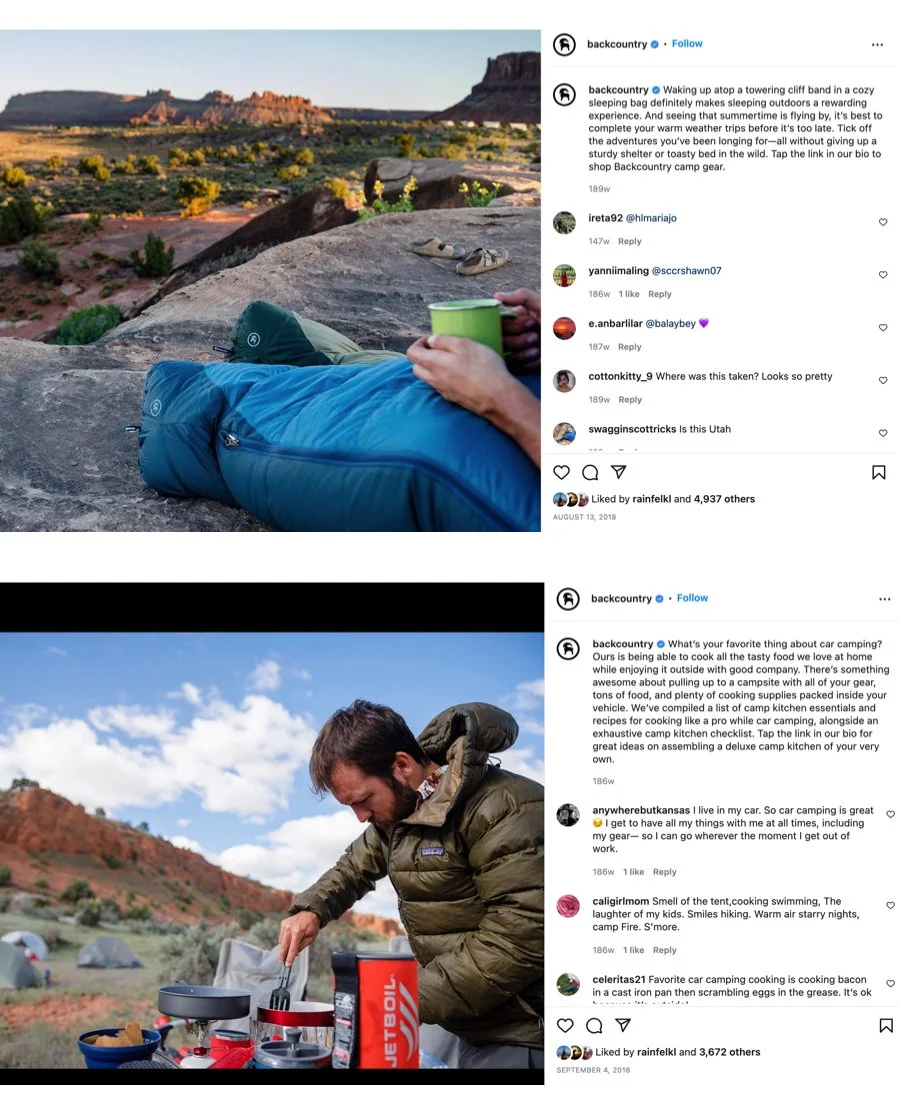 I worked closely with our social media manager at Backcountry on weekly posts across a variety of social channels. These particular posts went out on the Backcountry Instagram feed and highlighted our camping gear and apparel.