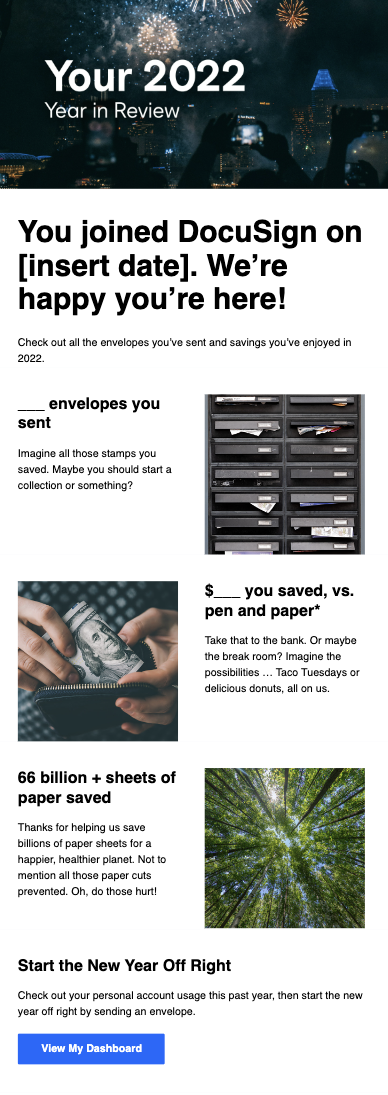The campaign goal was to drive customers back in-product to view their eSignature dashboard — by showing them how much money they saved, plus highlight Docusign’s commitment to sustainability.