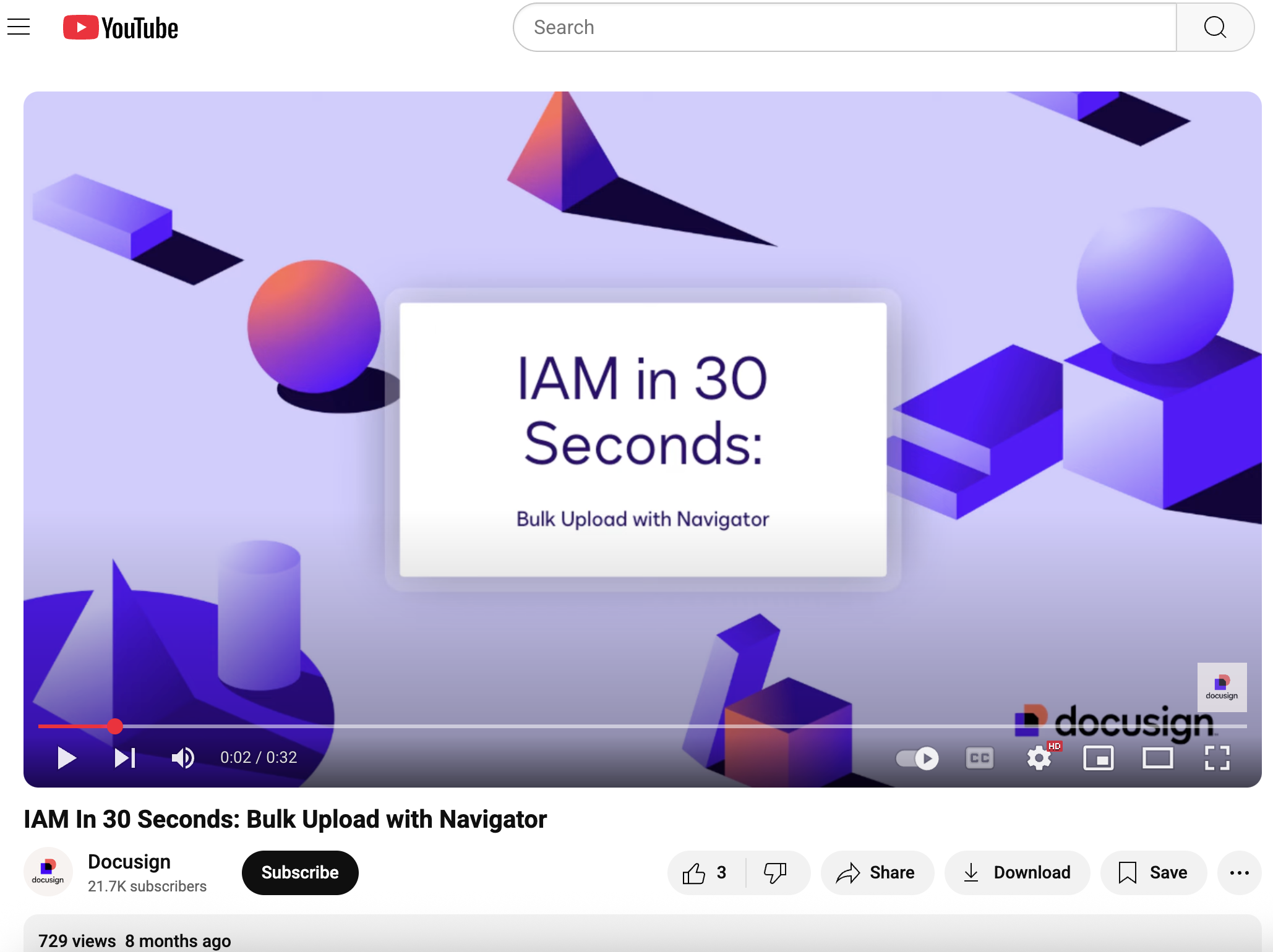729 views represents +30% in viewers vs. the average Docusign YouTube video during this same time period.
